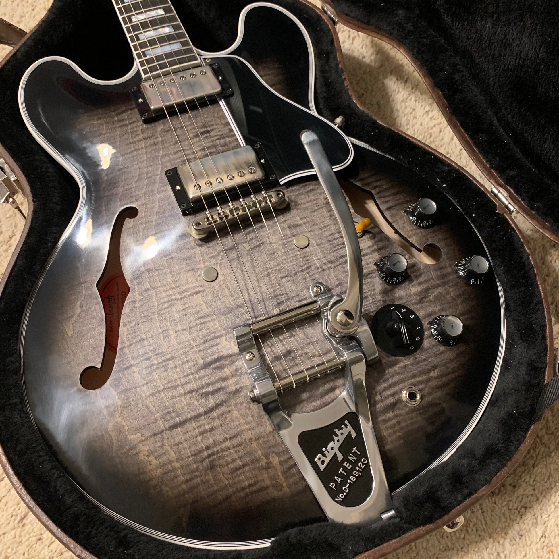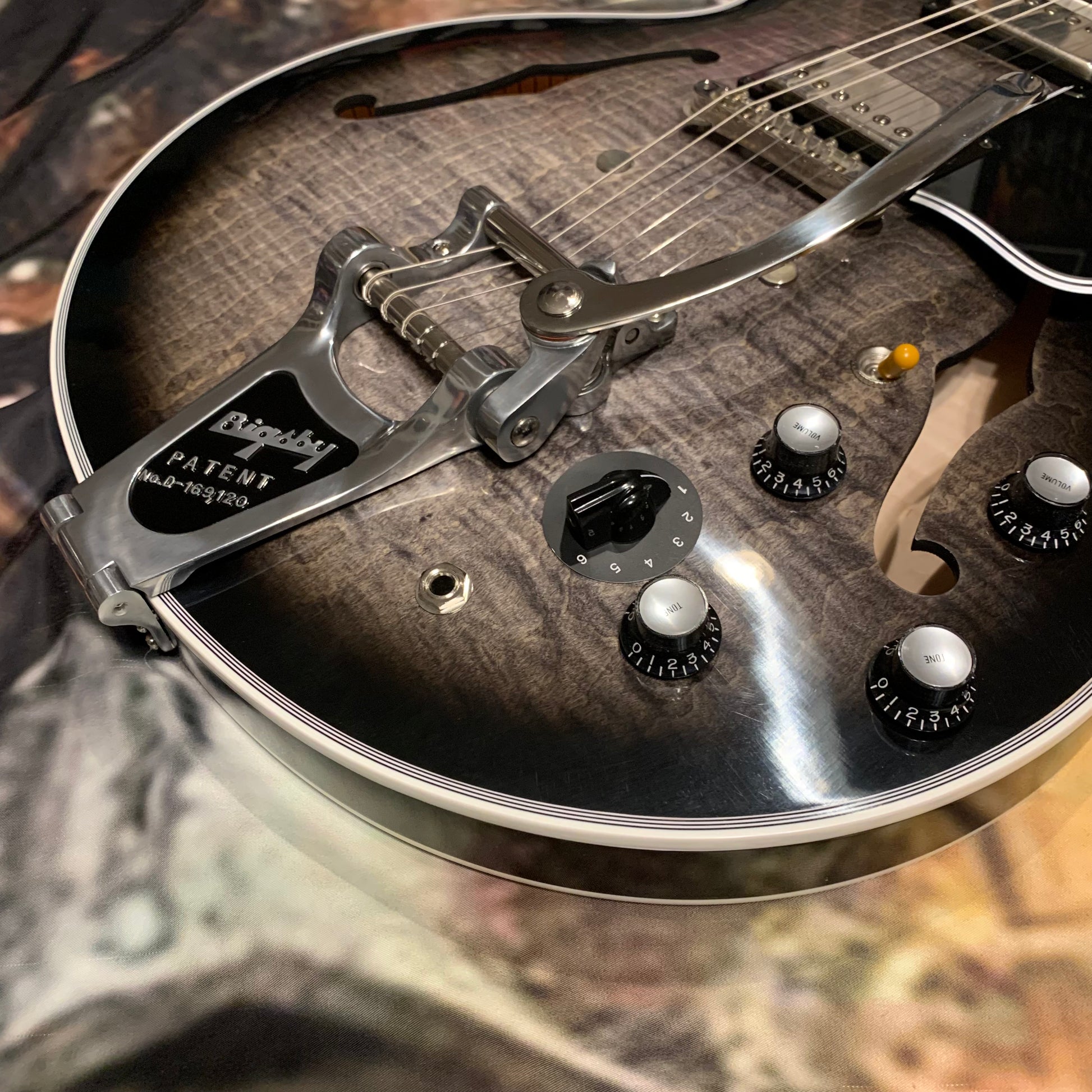 The Gibson Custom Shop has been making most recent Signature models as reissues of vintage instruments owned by the artist, but for this Gary Clark Jr. Signature ES-355, they’ve gone in the other direction and created a new model tailored to the artist’s prefrences. This Gary Clark Jr. signature model is a pretty sweet one too - the Cobra Burst VOS finish is distinctive, and complimented well by the nickel hardware. It’s unusual for an ES-355 to have nickel hardware, as they usually come with gold. Cobra Burst is a slick finish Gibson uses only sparingly, so it adds to the unique vibe of this ES-355. It’s also equipped with CustomBuckers and Grover Rotomatic tuners. A mono Varitone and Bigsby B7 are other unique additions which enhance the tonal opportunities available. The special case and COA tie the package together nicely too. This signature 355 is destined to become a desirable one, as only 100 were available worldwide as a very limited edition.