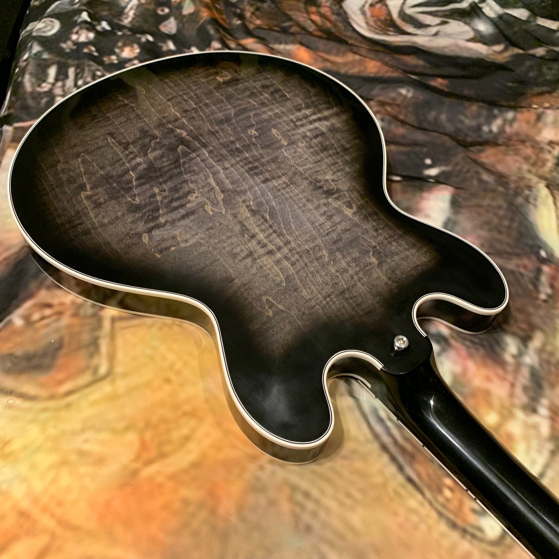 The Gary Clark Jr. ES-355 features a three-ply maple/poplar/maple body with a figured maple outer layer, a mahogany neck with a 50s Rounded Medium C profile, and a bound ebony fretboard equipped with 22 Historic medium jumbo frets and adorned with mother-of-pearl block inlays. The body has multi-ply top and back binding, and the headstock is also multi-ply bound and features the Custom split diamond inlay in mother-of-pearl and is equipped with Grover® Rotomatic® with Kidney button tuners.